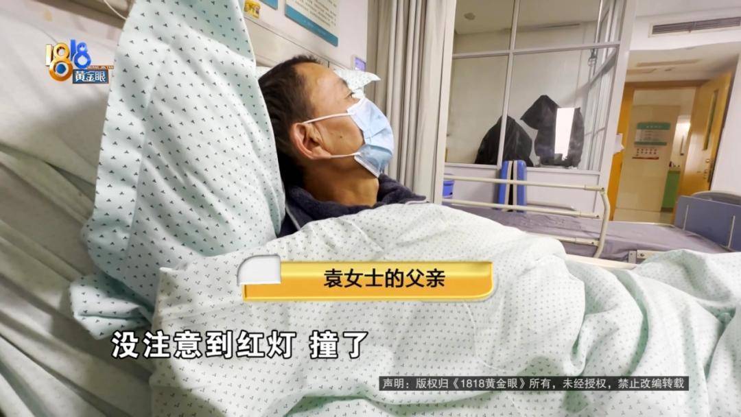 袁女士的父亲:上班做了一宿到第二天,回家下班,累一点,没注意到红灯撞的。对方车子相当快的,我也看不到。