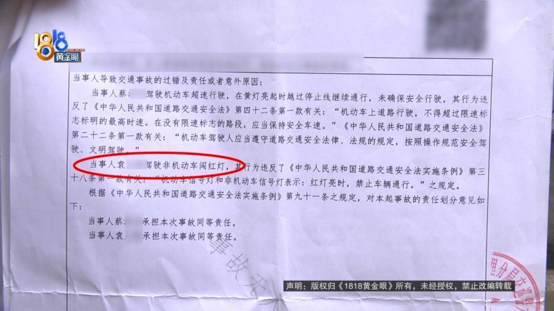 事故成因分析指出:“蔡先生驾驶机动车超速行驶,黄灯亮起时越过停止线继续通行”。袁女士的父亲“驾驶非机动车闯红灯”,双方在本次事故中承担同等责任。