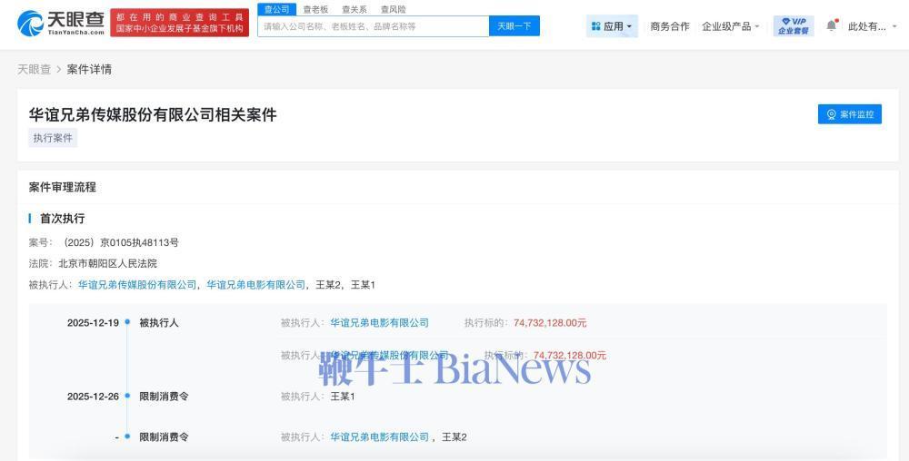12月29日,天眼查App显示,近日,华谊兄弟电影有限公司、王忠磊(王中磊)、华谊兄弟传媒股份有限公司、王忠军(王中军)新增一则限制消费令,案件流程信息显示,华谊兄弟电影有限公司、华谊兄弟传媒股份有限公司已因此案被执行7473万余元。